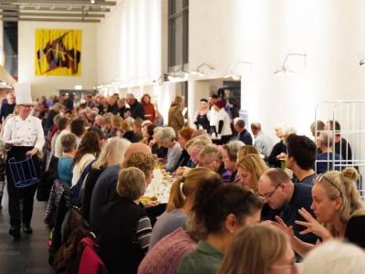 Velkommen til fællesspisning i vandrehallen på Hillerød Bibliotek.