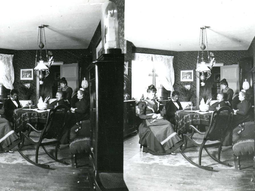 Mellem de mange hundrede glaspladenegativer fra Carl Rathsach lå der andre glasplader med stereobilleder, bl.a. et fra Slotsgade 41, hvor man ser en del af familien Rathsach hygge sig i stuen. Fotografiet er formentlig optaget af Peter Elfelt omkring 1900. Åge Rathsach blev født i 1882 og sidder som nr. 2 fra venstre.