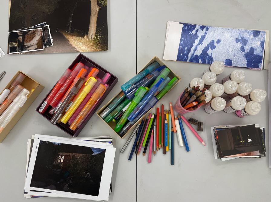 Mette fylder rummet med farver, materialer og masser af inspiration. Du kan farvelægge, tegne videre på eller på anden måde forandre fotos til små personlige kunstværker. Medbring gerne dine egne billeder, eller print dem hos os, hvis du vil arbejde med noget særligt.