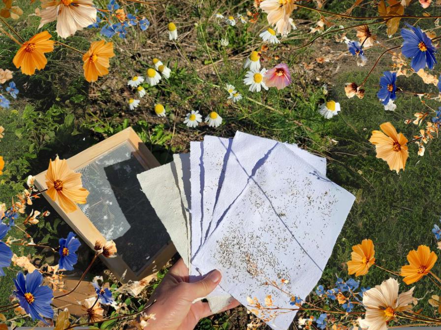 Du får fingrene i vand, papirmasse og farver og går hjem med dine egne unikke papirværker, som både kan bruges og plantes. Når papiret lægges i jorden, spirer det og bliver til vilde blomster, der støtter biodiversiteten.