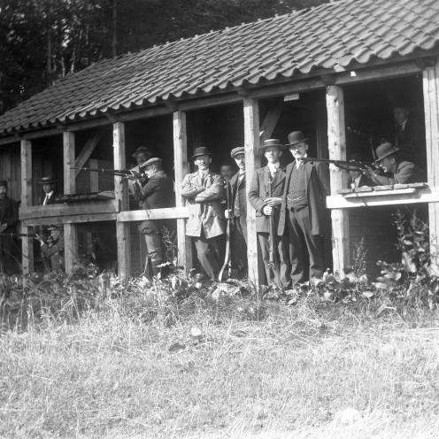 Carl Kern-Hansen har optaget flere fotografier fra fugleskydningsselskabets arrangementer. Selskabet blev etableret i 1899, og i starten havde man skydeplads ved Holmegården i Hillerød Øst. Senere flyttede man til Tyvekrogen, der lå for enden af Elmegårds Alle, hvor skydebanen lå i flere årtier frem til 1946. Da Elmegårdskvarteret i 1960’erne blev udstykket til boliger, hed den sidste vej i området Tyvekrogen, men folk ville ikke bo på en vej med det navn, så vejen blev omdøbt til Løvspringet.