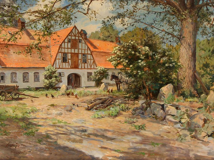 Carlo Hornung Jensen (1882-1960) malede flere skønne malerier af Sandviggård. Det er fra 1954 kort før gården blev nedrevet.